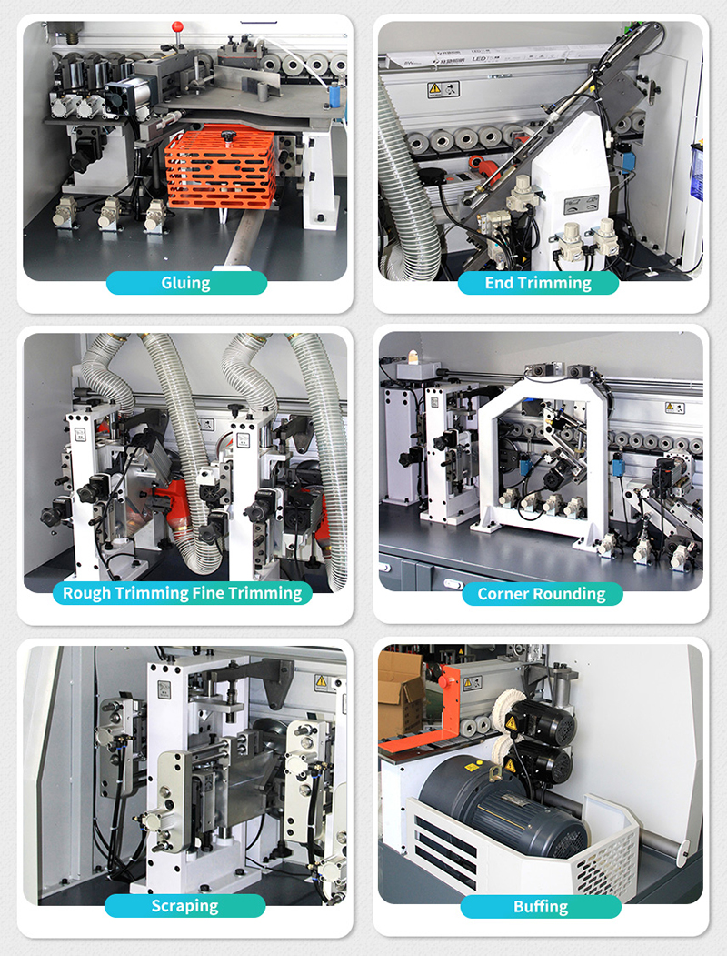 آلة ربط الحواف لديها 8 وظائف، التلميع، الكشط، التشذيب الدقيق والخشن، تتبع الحافة المستديرة، تشذيب الأطراف ولصقها، وتدعم التقليب والنقل التلقائي.